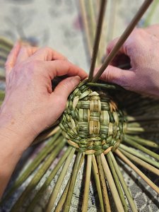 Zum Schluss nähen wir die drei Teile zusammen und befestigen einen Riemen. Die langen grünen Stiele der Binse sind nach kurzer Weichzeit verarbeitbar. Die Flechttechnik ist einfach und das Material weich.
